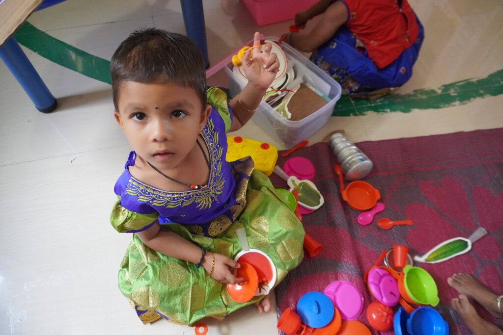 Play sits at the heart of this approach. Through songs, stories, games, art, and movement, children naturally develop early literacy, numeracy, and socio-emotional skills. Learning is embedded in everyday experiences, making it joyful, meaningful, and age-appropriate rather than forced or abstract. Equally important is the role of adults in these spaces. Young children learn best when adults observe, respond, and guide rather than instruct. Supporting Anganwadi teachers to become facilitators of learning—who follow children’s interests, encourage curiosity, and create opportunities for participation rather than rote responses—is central to nurturing meaningful early learning experiences.